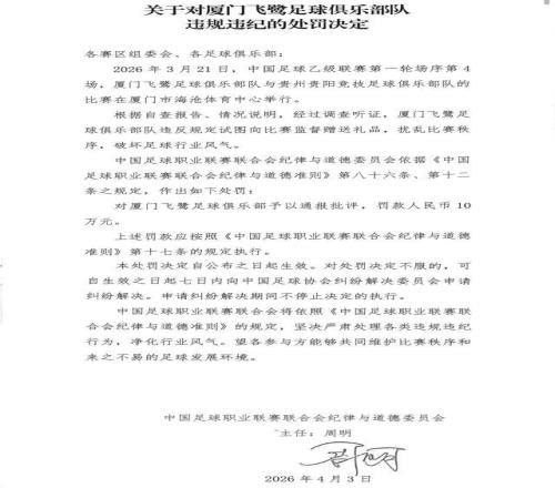 4月3日,中足联发布处罚公告:中甲石家庄功夫在对阵长春亚泰的比赛时试图向裁判员赠送礼品,中乙厦门飞鹭在对阵贵州贵阳竞技的比赛中试图向比赛监督赠送礼品,两队都被通报批评,并罚款10万元人民币。此外,中乙厦门赛区(厦门飞鹭主场)“将应由赛区负责的比赛官员接待工作违规转由第三方执行”,被通报批评。